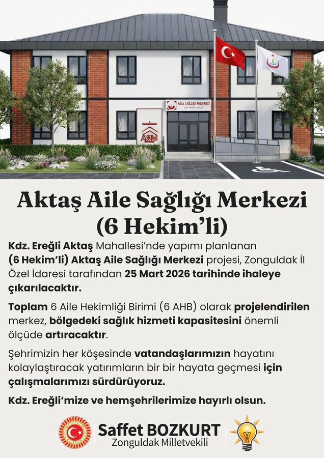 Kdz. Ereğli Aktaş Mahallesi’nde yapımı planlanan (6 Hekim’li) Aktaş Aile Sağlığı Merkezi projesi, Zonguldak İl Özel İdaresi tarafından 25 Mart 2026 tarihinde ihaleye çıkarılacaktır.