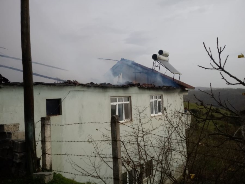 İtfaiye ekiplerinin müdahale ettiği yangında çatı tamamen yandı.