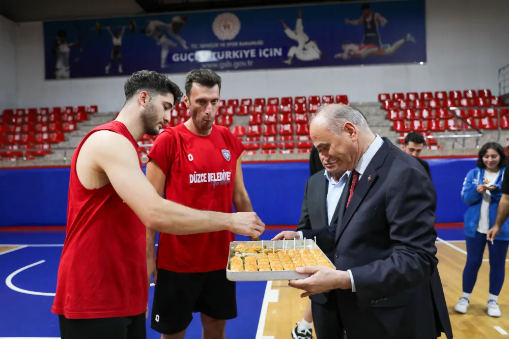 Düzce Belediye Başkanı Dr. Faruk Özlü, Türkiye Voleybol Federasyonu (TVF) Erkekler 1. Ligi’nde mücadele eden Düzce Belediyesi Spor Akademisi Voleybol Takımı’nın antrenmanını ziyaret etti. Özlü, Fenerbahçe SK galibiyetinden dolayı takımı tebrik ederek, sporculara baklava ikram etti.