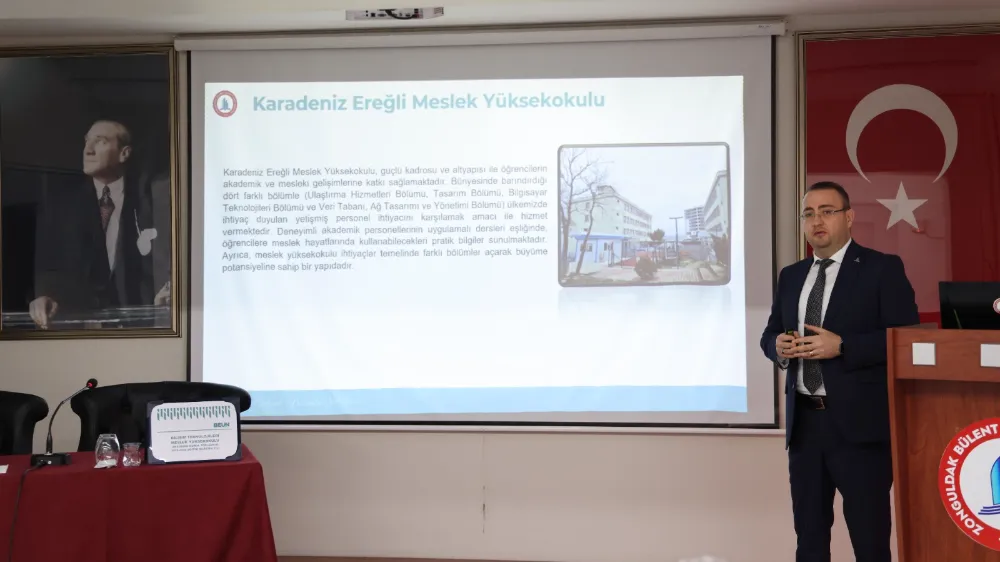 Yapılan sunumların ardından konuşan Rektör Yardımcısı Prof. Dr. Şenol Hakan Kutoğlu, 2024–2025 Akademik Yılı’na ilişkin kapsamlı bir değerlendirmede bulundu. Konuşmasında, 2025–2026 Akademik Yılı Bahar Dönemi’nin Zonguldak Bülent Ecevit Üniversitesi ailesi için hayırlı olmasını temenni eden Prof. Dr. Kutoğlu, yeni dönemin başarılarla dolu geçmesini diledi. Meslek yüksekokullarının yalnızca akademik başarılarıyla değil; aynı zamanda kamu kurum ve kuruluşları ile ilgili sektörlerle yürüttükleri bilimsel projeler, akademik iş birlikleri ve toplumsal katkı odaklı faaliyetlerle de öne çıktığını vurgulayan Prof. Dr. Kutoğlu, meslek yüksekokullarının üniversite bünyesinde hem teorik hem de uygulamalı eğitim açısından son derece önemli bir konuma sahip olduğunu ifade etti.