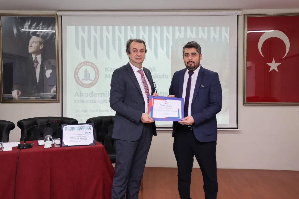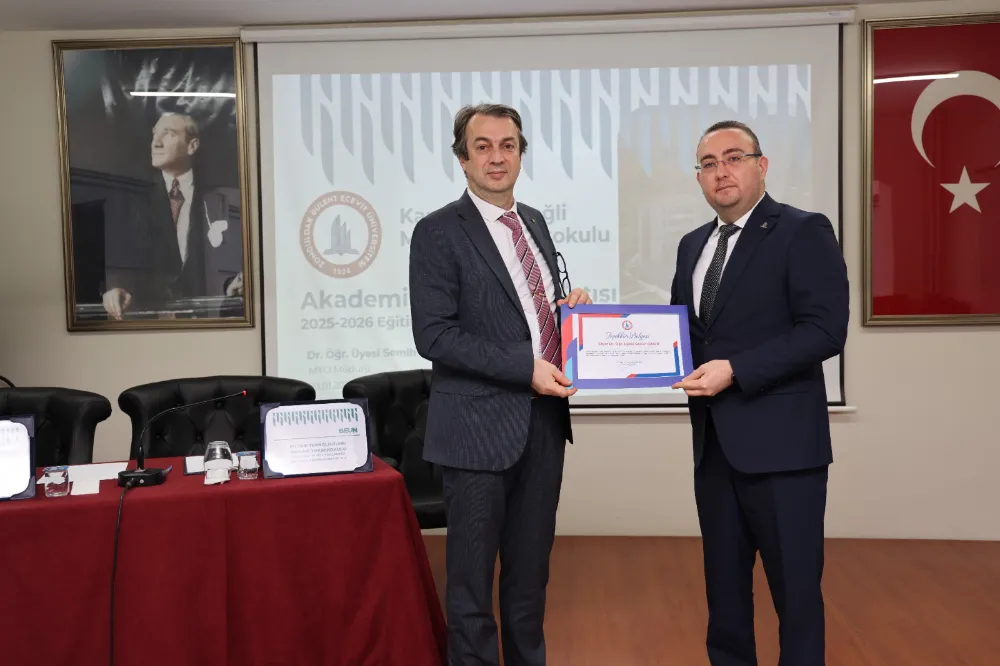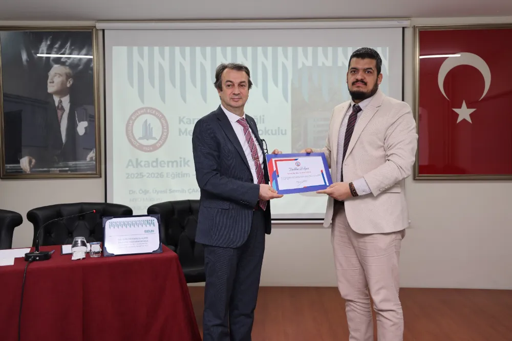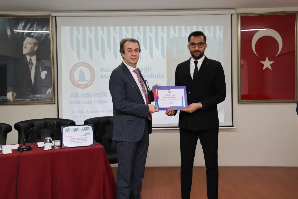 Karadeniz Ereğli Meslek Yüksekokulu ile Bilişim Teknolojileri Meslek Yüksekokulu 2025–2026 Akademik Yılı Akademik Kurul Toplantısı, BEUN Rektör Yardımcısı Prof. Dr. Şenol Hakan Kutoğlu’nun ulusal ve uluslararası indekslerde yayımlanan bilimsel çalışmalarıyla öne çıkan akademisyenlere teşekkür belgelerini takdim etmesi ve hatıra fotoğrafı çekimiyle sona erdi.