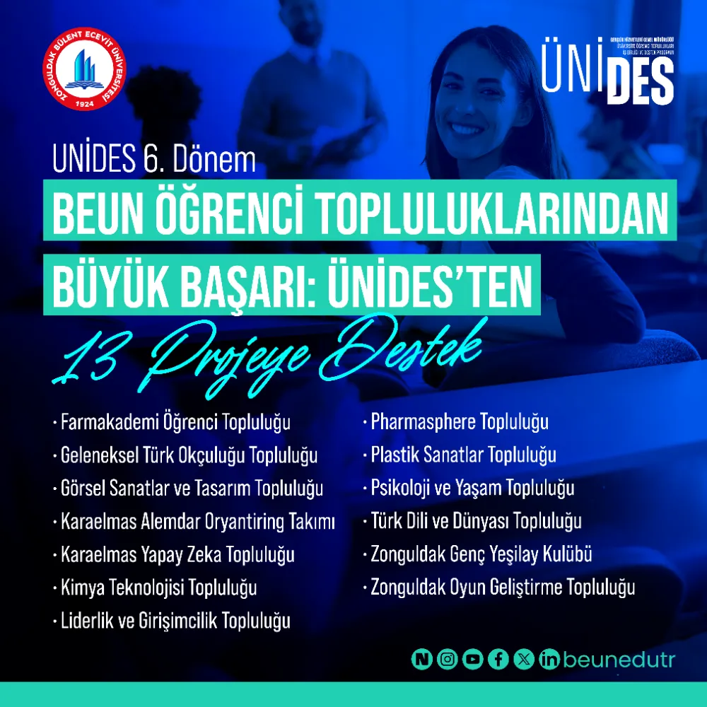 Zonguldak Bülent Ecevit Üniversitesi (BEUN) bünyesinde faaliyet gösteren öğrenci topluluklarının, Üniversite Öğrenci Kulüplerine Destek Programı (ÜNİDES) kapsamında sundukları projelerden 13’ü destek almaya hak kazanarak önemli bir başarıya imza attı.