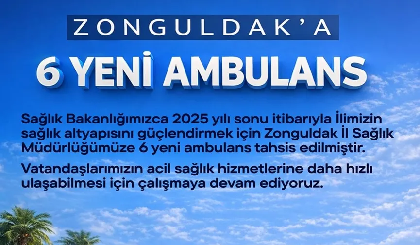 " Sağlık Bakanlığımızca 2025 yılı sonu itibarıyla İlimizin sağlık altyapısını güçlendirmek için Zonguldak İl Sağlık Müdürlüğümüze 6 yeni ambulans tahsis edilmiştir.