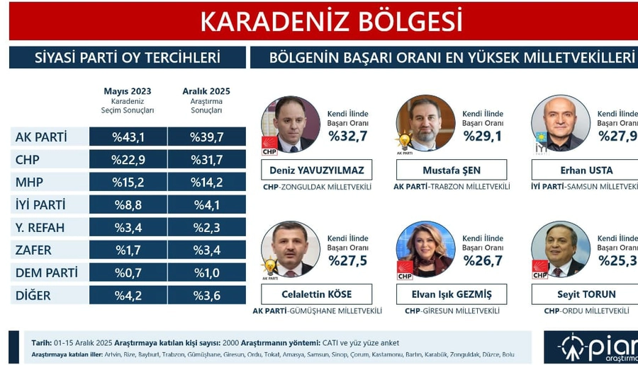 1–15 Aralık 2025 tarihleri arasında, 2 bin kişiyle CATI ve yüz yüze görüşme yöntemiyle gerçekleştirilen araştırmaya göre, Karadeniz Bölgesi’nin başarı oranı en yüksek milletvekili bir kez daha CHP Genel Başkan Yardımcısı ve Zonguldak Milletvekili Deniz Yavuzyılmaz oldu.