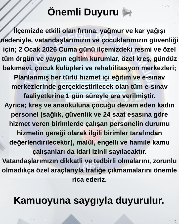 ‘İlçemizde etkili olan fırtına, yağmur ve kar yağışı nedeniyle, vatandaşlarımızın ve çocuklarımızın güvenliği için; 2 Ocak 2026 Cuma günü ilçemizdeki resmi ve özel tüm örgün ve yaygın eğitim kurumlar, özel kreş,gündüz bakımevi,çocuk kulüpleri ve rehabilitasyon merkezleri; planlanmış her türlü hizmet içi eğitim ve e-sınav merkezlerinde gerçekleştirilecek olan tüm e-sınav faaliyetlerine 1 gün süreyle ara verilmiştir.