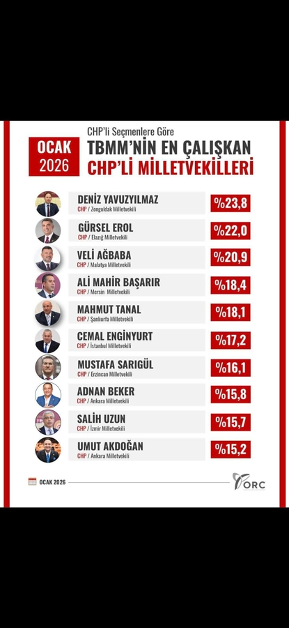 ORC Araştırma Şirketi’nin 2026 yılı Ocak ayında gerçekleştirdiği “TBMM’nin En Çalışkan CHP Milletvekilleri” araştırmasının sonuçları açıklandı.