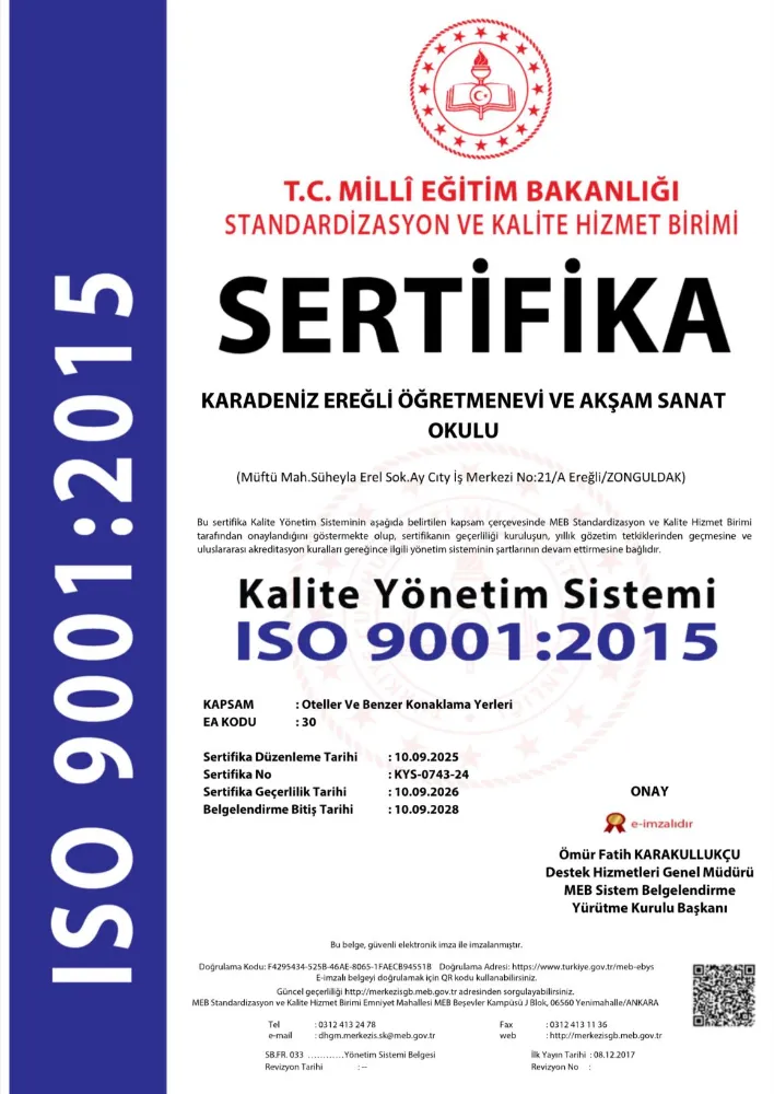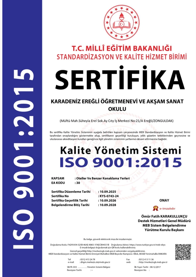 Zonguldak Ereğli Öğretmenevi ve Akşam Sanat Okulu, Millî Eğitim Bakanlığı Standardizasyon ve Kalite Hizmet Birimi ISO 9001:2015 Sertifikası almaya hak kazandı.
