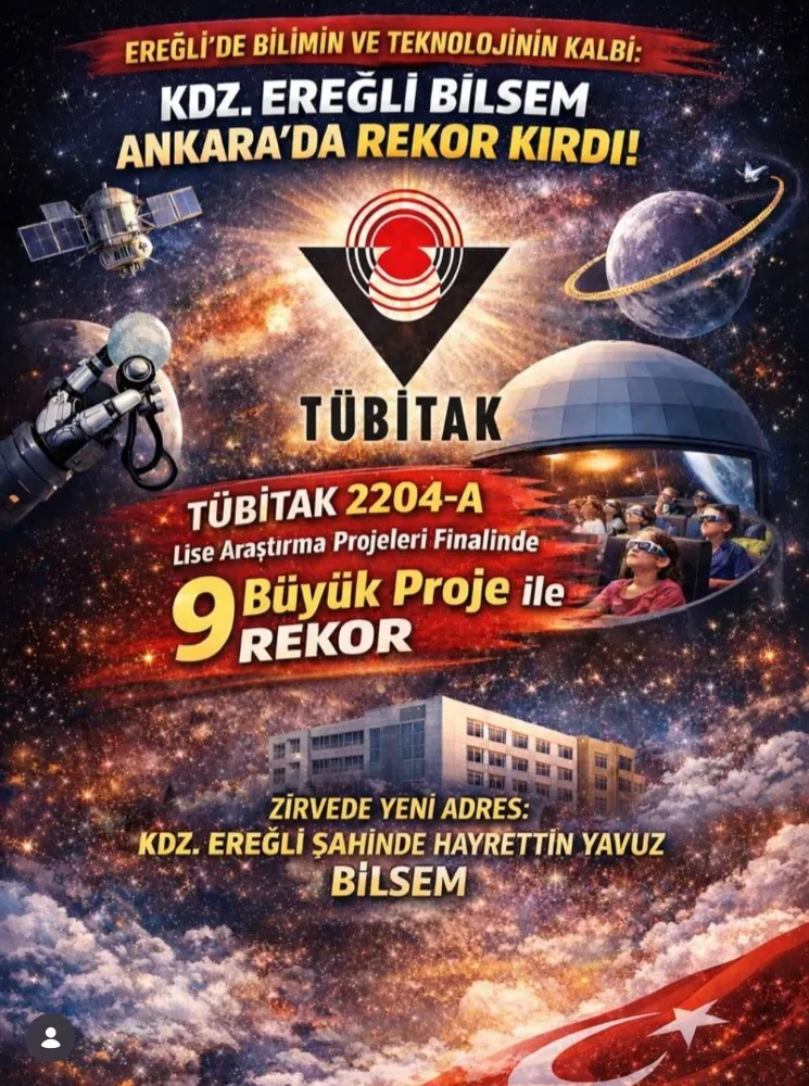 Karadeniz Ereğli Şahinde Hayrettin Yavuz Bilim ve Sanat Merkezi, TÜBİTAK 2204-A Lise Öğrencileri Araştırma Projeleri Yarışması kapsamında Ankara Bölge Sergisi’ne 9 proje ile davet edilerek tarihi bir başarıya imza attı. Bu sonuçla merkez, Ankara dâhil olmak üzere bölgedeki tüm okulları geride bırakarak Zonguldak tarihinin en yüksek proje sayısına ulaştı.