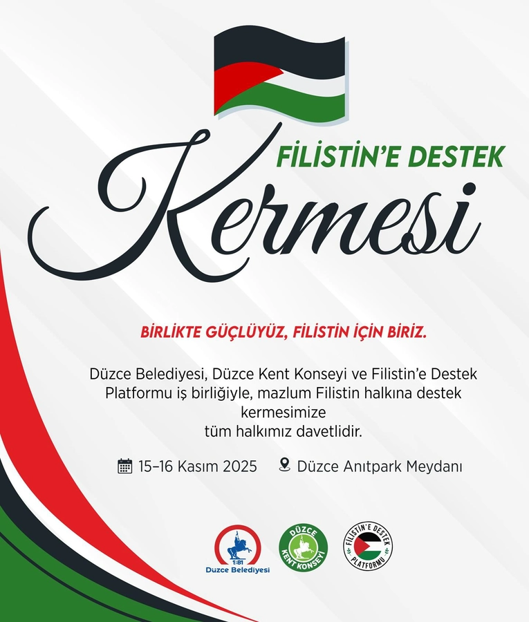 Düzce Belediyesi, Düzce Kent Konseyi ve Filistin’e Destek Platformu iş birliğiyle Filistin halkına destek amacıyla anlamlı kermes düzenleniyor. “Birlikte Güçlüyüz, Filistin İçin Biriz” sloganıyla gerçekleştirilecek olan kermes, 15-16 Kasım tarihlerinde Düzce Anıtpark Meydanı’nda vatandaşlarla buluşacak.