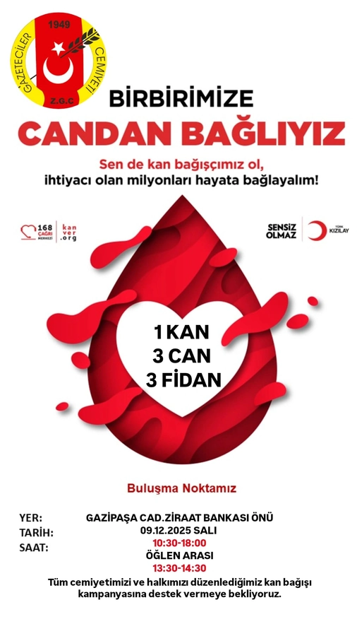 Zonguldak Gazeteciler Cemiyeti, iş birliği içinde olduğu Türk Kızılayı ile birlikte 9 Aralık 2025 Salı günü bir kan bağış kampanyası düzenliyor. Kent merkezindeki Gazipaşa Caddesi üzerindeki Ziraat Bankası önünde gerçekleştirilecek kampanya saat 1O.30–18.O0 arasında olacak.