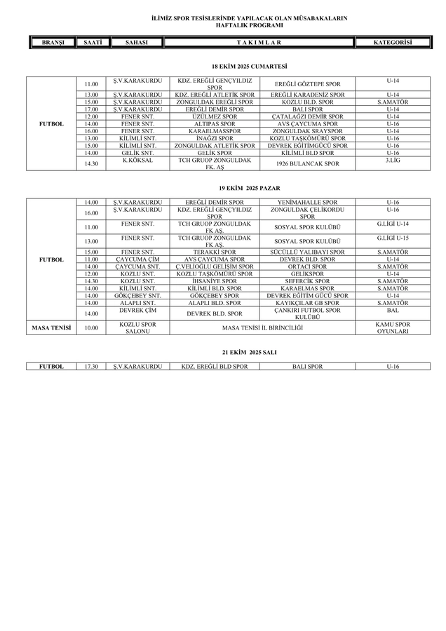 İLİMİZ SPOR TESİSLERİNDE YAPILACAK OLAN MÜSABAKALARIN HAFTALIK PROGRAMI