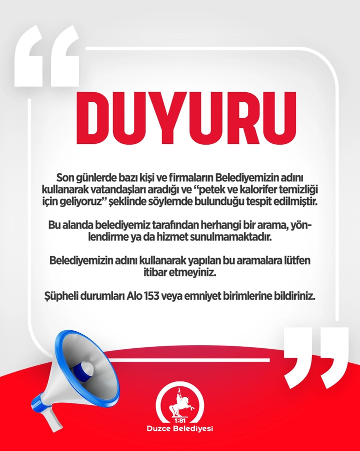 Düzce Belediyesi, vatandaşların aranarak “Düzce Belediyesi’nden arıyoruz, petek ve kalorifer temizliği yapmak için geleceğiz” dediğini tespit etti. Sosyal medya ve 153 Beyaz Masa üzerinden gelen şikayetleri değerlendiren ekipler yaşananların dolandırıcılık girişimi olduğuna dikkat çekerek yayımladığı duyuruda şu ifadeleri kullandı: “Son günlerde bazı kişi ve firmaların Belediyemizin adını kullanarak vatandaşları aradığı ve “petek ve kalorifer temizliği için geliyoruz” şeklinde söylemde bulunduğu tespit edilmiştir. Bu alanda belediyemiz tarafından herhangi bir arama, yönlendirme ya da hizmet sunulmamaktadır. Belediyemizin adını kullanarak yapılan bu aramalara lütfen itibar etmeyiniz. Şüpheli durumları Alo 153 veya emniyet birimlerine bildiriniz.”