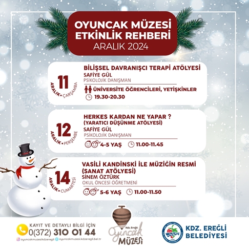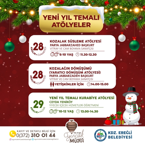 Kdz. Ereğli Belediyesi Oyuncak Müzesi Koordinatörü Melih Can Tanrıkulu, Aralık ayı içerisinde gerçekleşecek atölye çalışmalarını açıkladı. Oyuncak Müzesi Atölye çalışmalarına katılmak isteyen veliler 0372 310 01 44 numaralı telefondan ön kayıt yaptırabilirler.