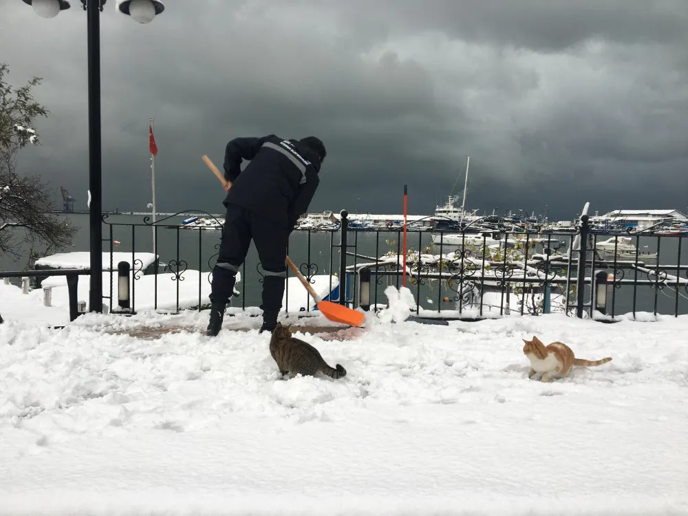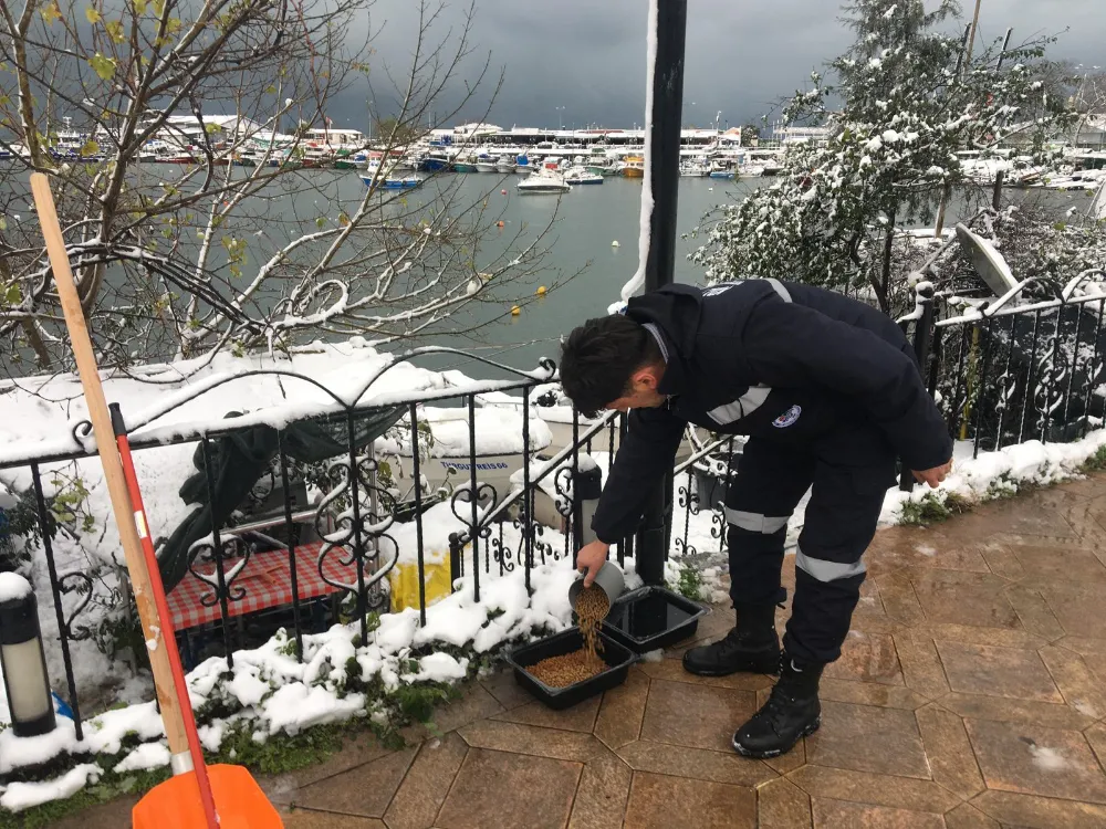 Kanatlı hayvanlar için Atatürk Anıtı ve sahil bölgesine yem bırakıldı, barakaları kardan temizlendi.