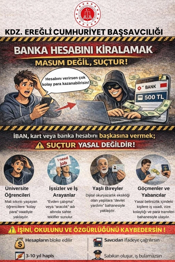 Kdz. Ereğli Cumhuriyet Başsavcısı Mustafa ERBAŞ tarafından yapılan açıklamada, son zamanlarda gençlere yönelik dijital dolandırıcılık olaylarının arttığı, özellikle 18-30 yaş arası gençlere "kolay para kazanma", "sadece hesabını ver", "hiçbir sorumluluğun yok" gibi vaatlerle banka IBAN numaralarını kiralayarak gençlerin mağduriyetine sebebiyet verilmesi nedeniyle dijital dolandırıcılık konusunda uyarı ve bilgilendirme hazırlığı yapıldığı, bu kapsamda dolandırıcıların gençlere ait banka hesaplarını kiralayarak internet alışveriş dolandırıcılığı, kripto para yatırım dolandırıcılığı, sosyal medya ve mesaj dolandırıcılığı, bahis ve kara para aklama, sahte iş, evden çalışma tuzağı, burs başvurusu, sosyal yardım vaadi, faizsiz kredi reklamı, evlilik kredisi reklamı, bireysel emeklilik sigortası, yurt dışı vize başvurusu reklamları, araç kiralama, araç muayenesi ve araç sigortası reklamları ve şantaj gibi suçlarda kullandıkları, bu nedenle hesabını kiralayan kişilerin 10 yıla kadar hapis cezasını gerektiren ağır cezalar ile tazminat ödemeyi gerektirir hukuki sonuçlar doğuran ciddi bir suç zincirinin parçası haline geldikleri bildirildi.