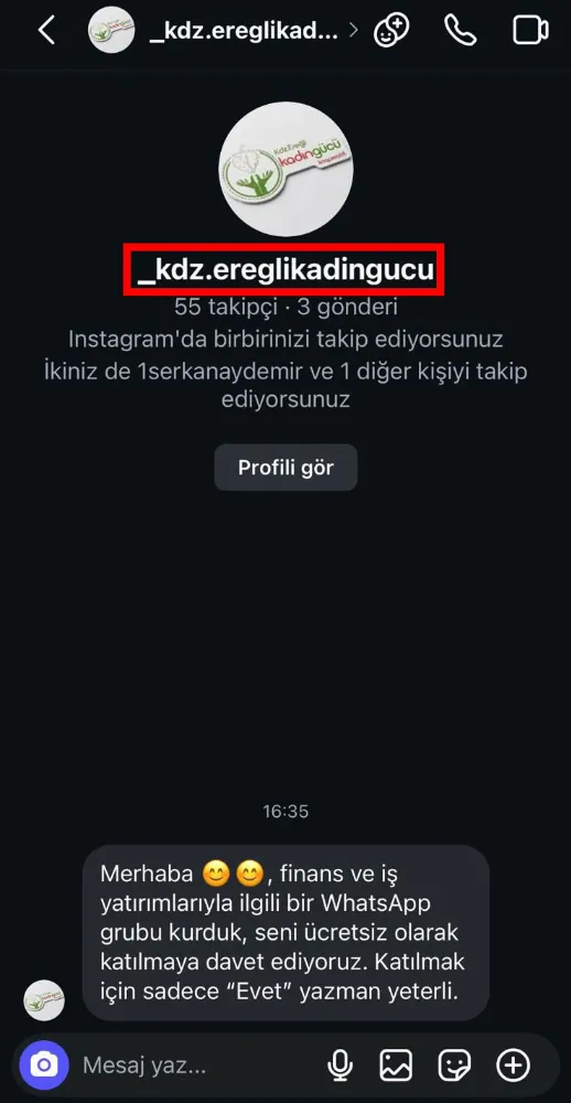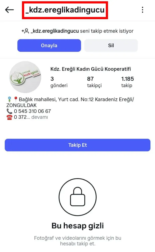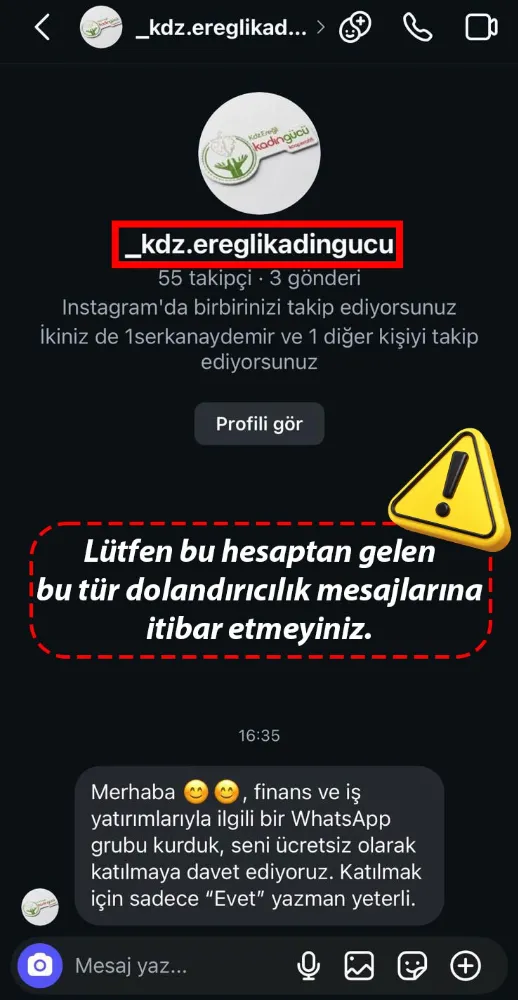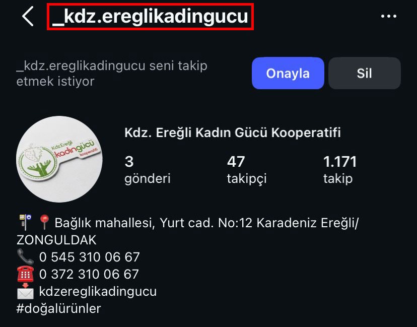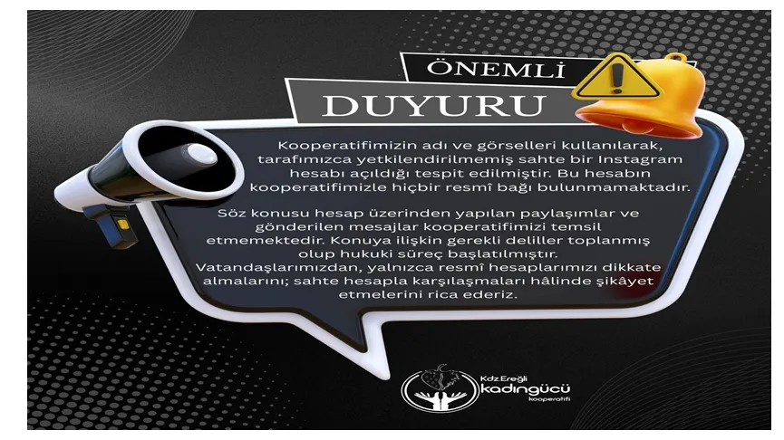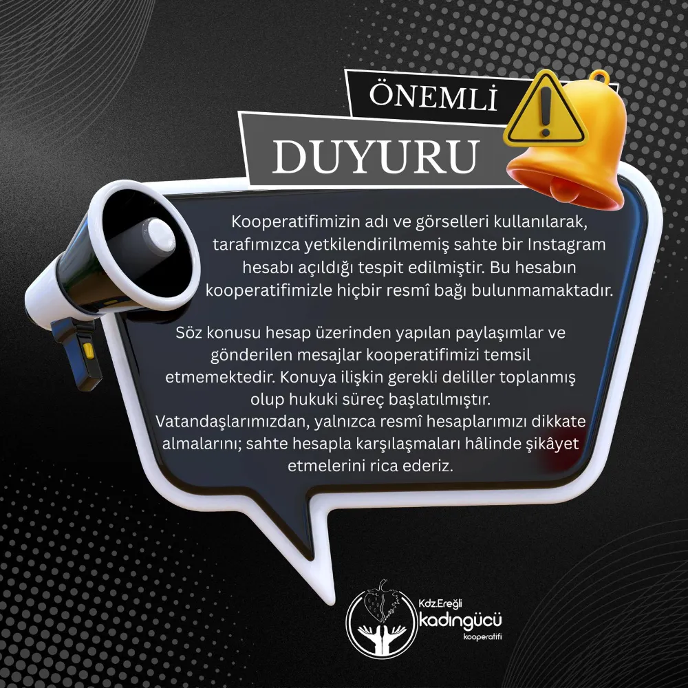 Kdz. Ereğli Kadın Gücü Kooperatifi’nin adı ve logosu kullanılarak, kooperatifimizle hiçbir ilgisi bulunmayan, tamamen sahte ve kötü niyetli bir Instagram hesabı açıldığı tespit edilmiştir. Söz konusu hesap, kooperatifimizi birebir taklit ederek kamuoyunu yanıltmayı, dolandırıcılığa varan girişimlerle vatandaşlarımızı hedef almayı amaçlamaktadır.