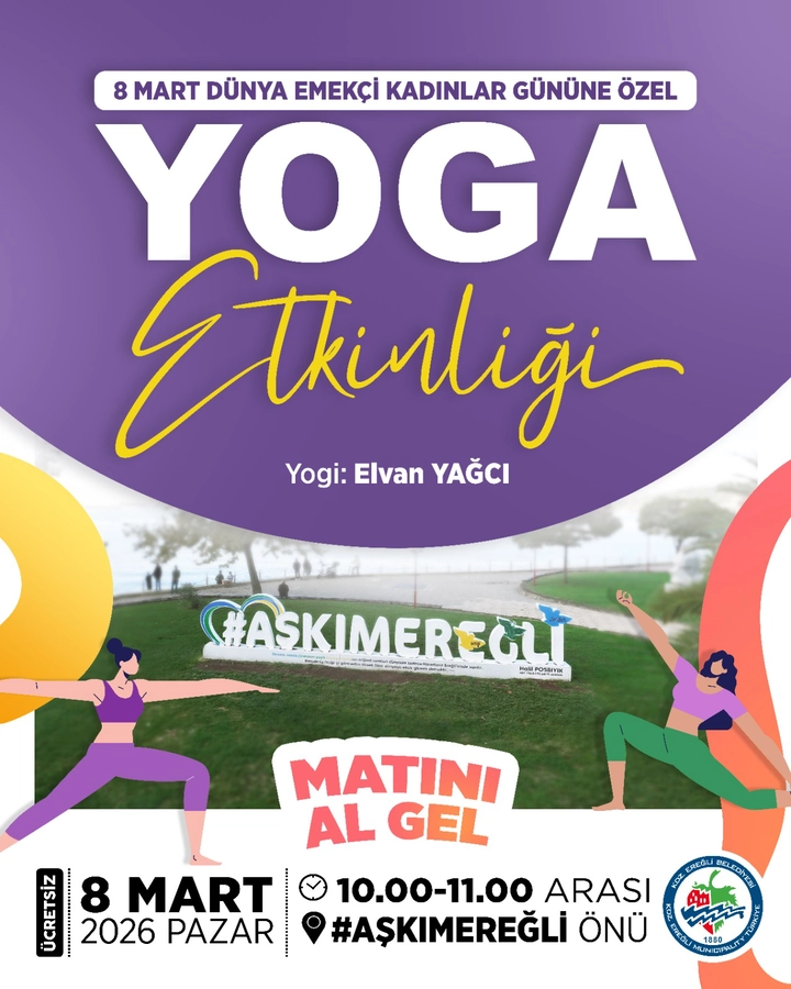 Kdz. Ereğli Belediyesi katkılarıyla, 8 Mart Dünya Emekçi Kadınlar Günü kapsamında birçok etkinlik düzenlenecek. Etkinlikler, 8 Mart Pazar günü sabah saatlerinde sahilde gerçekleştirilecek yoga etkinliği ile başlayacak. Yoga Eğitmeni Elvan Yağcı eşliğinde yapılacak olan etkinlik, saat 10.00 – 11.00 arasında sahilde bulunan Aşkım Ereğli önünde gerçekleştirilecek. Doğa ile iç içe gerçekleşecek bu etkinlikte kendi matlarını getirecek olan katılımcılar hem bedenlerini hem de zihinlerini dinlendirme fırsatı bulacak.