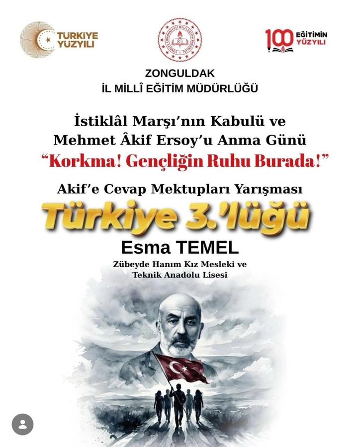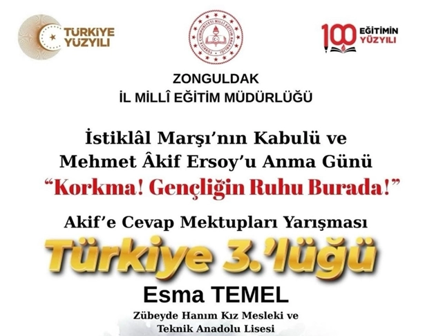 İstiklal Marşı’nın kabulü ve Mehmet Akif Ersoy’u Anma Günü etkinlikleri kapsamında düzenlenen “Akif’e Cevap Mektupları” yarışmasında Kdz. Ereğli’den önemli bir başarı elde edildi.