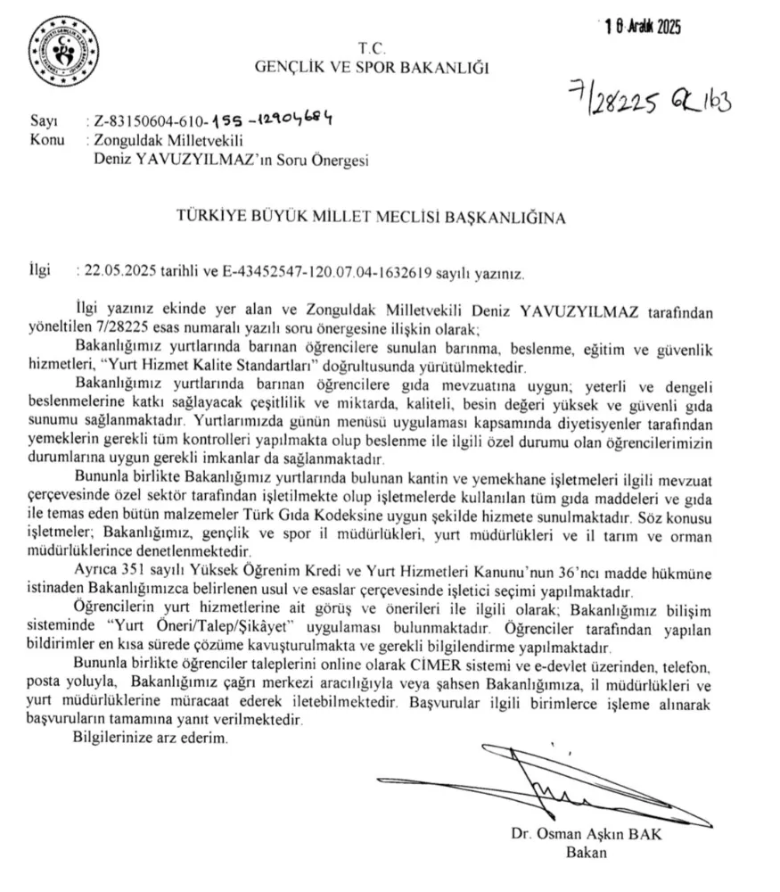 Zonguldak’taki KYK yurtlarında yaşanan yemek, hijyen ve barınma sorunlarına ilişkin CHP Genel Başkan Yardımcısı ve Zonguldak Milletvekili Deniz Yavuzyılmaz’ın verdiği soru önergesine, Gençlik ve Spor Bakanlığı yanıt verdi. Ancak Bakan Osman Aşkın Bak tarafından aylar sonra verilen yanıtında, Zonguldak’ta Üniversite öğrencilerin yaşadığı barınma sorunlarının nedenini açıklamak yerine, sorumluluğu örtmeye yönelik genel ifadeler dikkat çekti.