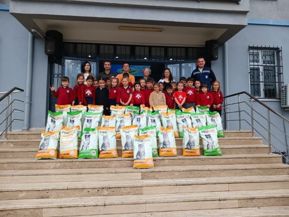 Nurdan ve Ahmet Orhan Oğuz İlkokulu öğrencileri, Hayvanları Koruma Günü nedeniyle belediye barınağına mama desteğinde bulundu.