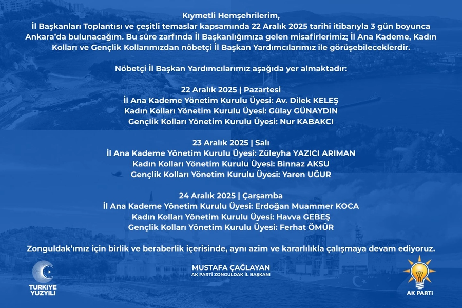 İl Başkanları Toplantısı ve çeşitli temaslar kapsamında 22 Aralık 2025 tarihi itibarıyla 3 gün boyunca Ankara’da bulunacağım. Bu süre zarfında İl Başkanlığımıza gelen misafirlerimiz; İl Ana Kademe, Kadın Kolları ve Gençlik Kollarımızdan nöbetçi İl Başkan Yardımcılarımız ile görüşebileceklerdir.
