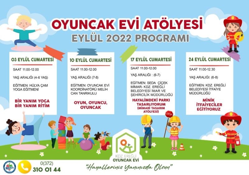 Yaz döneminde kısa bir süre atölye çalışmalarına ara veren Kdz. Ereğli Belediyesi Oyuncak Evi’nin Eylül ayı programı açıklandı. Atölye çalışmalarında; “Bir Yanım Yoga, Bir Yanım Ritim”, “Oyun, Oyuncu, Oyuncak”, “Hayalimdeki Parkı Tasarlıyorum”, “Minik İtfaiyeciler Eğitiyoruz” atölyeleri çocukları bekliyor.