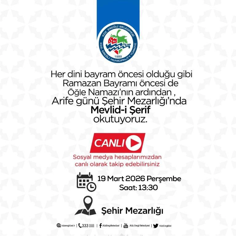 Kdz. Ereğli Belediyesi, arife günü şehir mezarlığında mevlid-i şerif programı düzenleyecek. Başkan Halil Posbıyık, Perşembe günü öğle namazına müteakip düzenlenecek mevlid programına halkı davet etti.