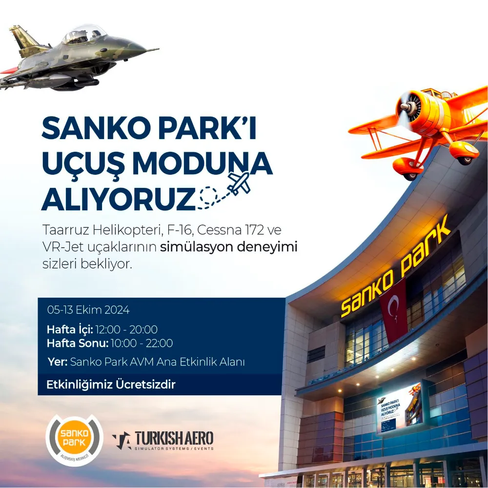 SANKO Park AVM Ana Etkinlik Alanında 5 Ekim’de başlayan etkinlikte ziyaretçiler Taarruz Helikopteri, F-16, Cessna 172 ve VR-Jet uçakları başta olmak üzere değişik amaçlı uçak simülasyonlarda pilotluk hayalini deneyimleyebilecekler.