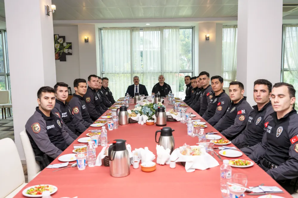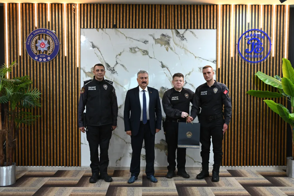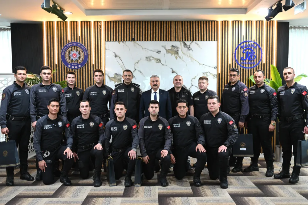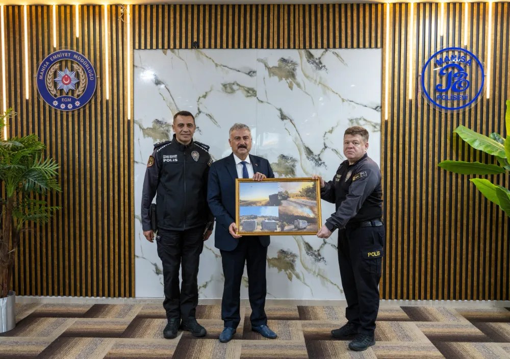 Manisa İl Emniyet Müdürü Sn. Fahri AKTAŞ, 2025 yılı yaz aylarında Manisa il merkezi/ilçelerimizde ve Çanakkale ilinde çıkan orman yangınlarını söndürme çalışmalarında canla başla mücadale eden Çevik Kuvvet Şube Müdürlüğü TOMA operatörleri personellerine ve Emniyet Müdürlüğü bünyesinde kullanılan TOMA araçlarının bakım/onarım işlemlerinde desteğini esirgemeyen Mercedes-Benz Has Otomotiv Satış Sonrası Hizmetleri Müdürü Sn. Fatih UGEY ile bir araya gelip özverili çalışmalarından dolayı hediyelerini takdim ederek teşekkürlerini iletti.