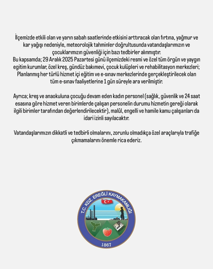 Kdz.Ereğli Kaymakamı Fatih Yılmaz, ilçemizde etkili olan ve yarın sabah saatlerinde etkisini arttıracak olan fırtına, yağmur ve kar yağışı nedeniyle 29 Aralık 2025 pazartesi günü ilçedeki resmi ve özel tüm örgün ve yaygın eğitim kurumları, özel kreş, gündüz bakımevi, çocuk kulüpleri ve rehabilitasyon merkezleri ile planlanmış her türlü hizmet içi eğitim ve e-sınav merkezlerinde gerçekleştirilecek olan tüm e-sınav faaliyetlerine 1 gün süreyle ara verildiğini duyurdu.