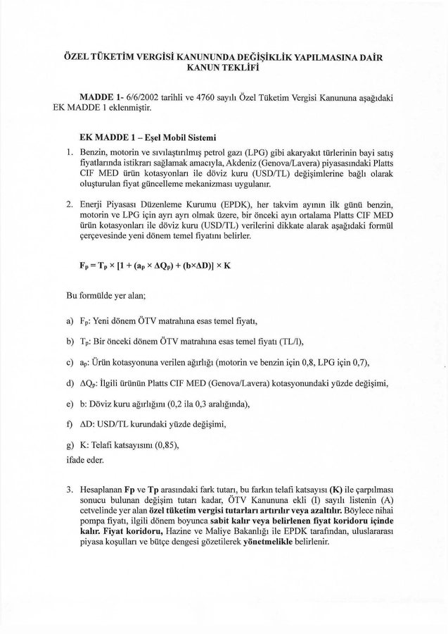 CHP Enerji Politikalarından Sorumlu Genel Başkan Yardımcısı ve Zonguldak Milletvekili Deniz Yavuzyılmaz’ın imzasını taşıyan teklif ile akaryakıt ürünlerine döviz kuru ve diğer değişimlerden kaynaklanan dalgalanmaların tüketiciye doğrudan yansımaması amacıyla ÖTV’den indirim sağlayan ve vatandaşı fahiş zamdan koruyan Eşel Mobil Sistemin yeniden hayata geçirilmesi amaçlanıyor.