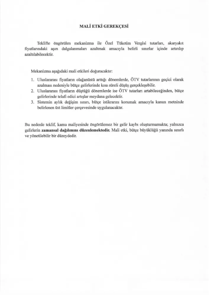 Akaryakıttaki tarihî fiyat artışlarına dikkat çeken Yavuzyılmaz, Akaryakıt fiyatlarındaki artışların tüm sektörlerde zincirleme etki yarattığını ve vatandaşın artık dayanacak gücünün kalmadığını vurgularken, teklifine ilişkin şunları aktardı: