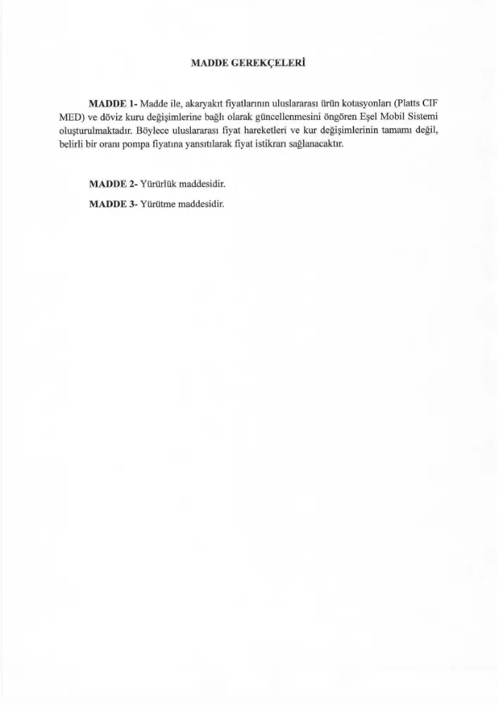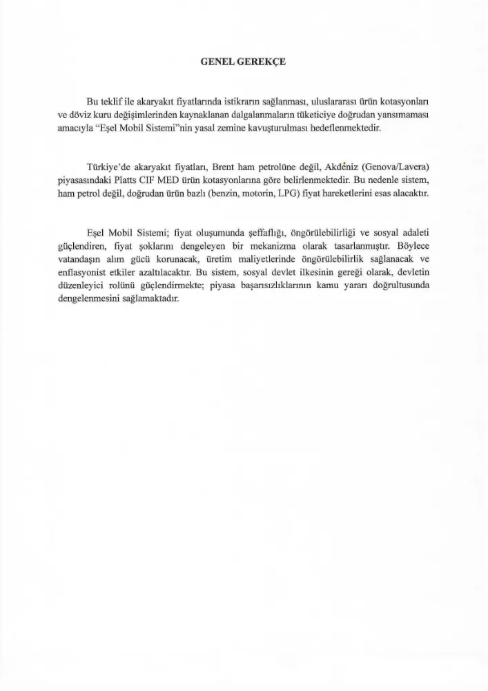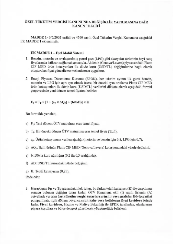 Akaryakıt ürünlerine döviz kuru ve diğer değişimlerden kaynaklanan dalgalanmaların tüketiciye doğrudan yansımaması amacıyla ÖTV’den indirim sağlayan ve vatandaşı fahiş zamdan koruyan Eşel Mobil Sistemi, 22 Aralık 2021 tarihli Resmî Gazete’de yayımlanan 4938 sayılı Cumhurbaşkanı Kararı ile kaldırıldı. Sistem kaldırıldıktan sonra vatandaşlar ani ve sık yaşanan zamlarla karşı karşıya kaldı. Ulaşım, ısınma ve gıda gibi birçok temel alanda kullanılan akaryakıt fiyatlarındaki artış, aile bütçelerine taşınamaz yükler bindirdi. Bugün özellikle dar ve orta gelir gruplarındaki milyonlarca vatandaşımız hayatlarını idame ettiremez hâle geldi. Bu nedenle zamlara karşı bir tampon görevi gören Eşel Mobil Sisteminin yeniden devreye alınması, vatandaşın alım gücünün bir nebze de olsa korunması amacıyla kanun teklifimizi Meclis başkanlığına sunmuş