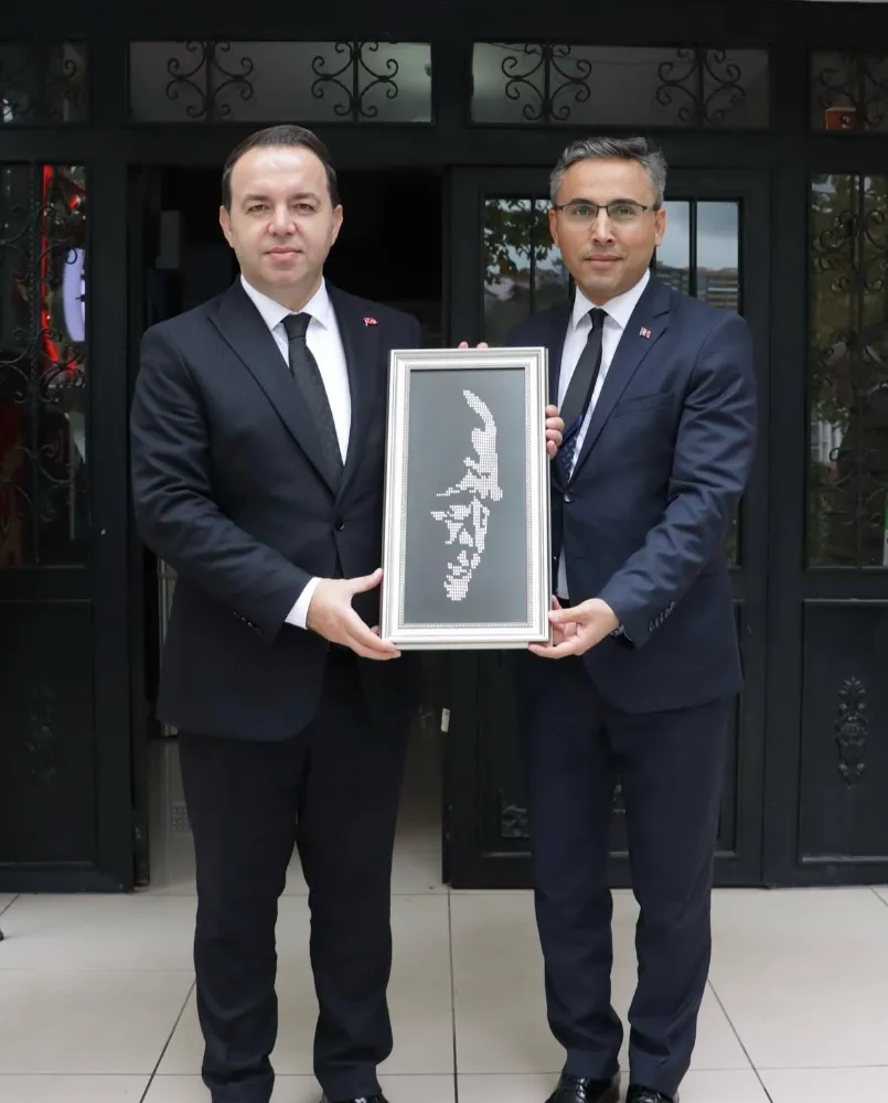 Halk Eğitimi Merkezi Müdürü Metin Bozkurt, İl Millî Eğitim Müdürü Uygar Keskin’e kursiyerler tarafından el emeğiyle hazırlanmış Atatürk portresi hediye etti.