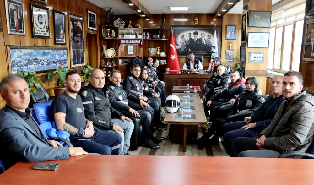 Zonguldak Motosiklet Sürücüleri Derneği (Zonguldak Riders) üyeleri, Genel Maden İşçileri Sendikası (GMİS) Genel Başkanı Hakan Yeşil’i ziyaret ederek Türk bayrağı ile destekleri için plaket takdim etti.